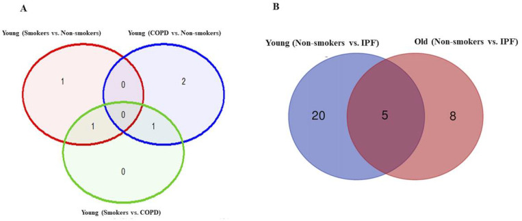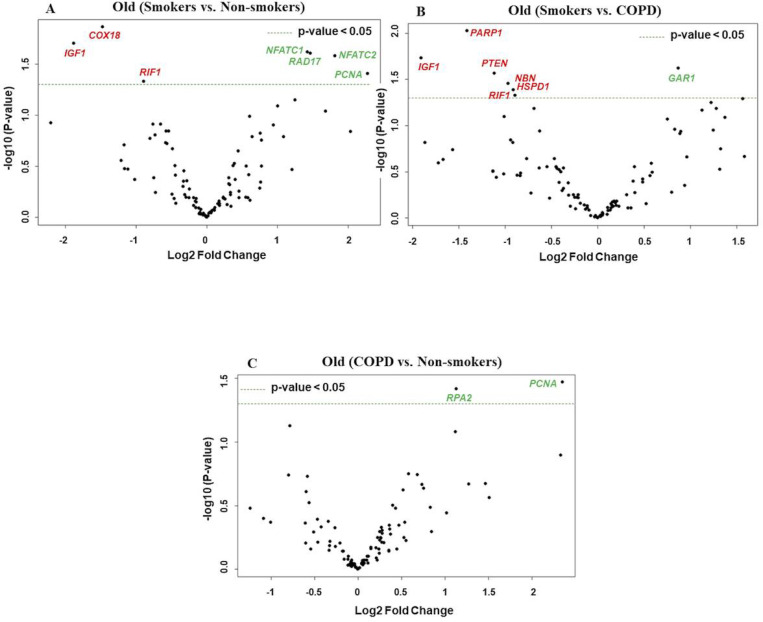 Aging is one of the key contributing factors for chronic obstructive pulmonary diseases (COPD) and other chronic inflammatory lung diseases. Cigarette smoke is a major etiological risk factor that has been shown to alter cellular processes involving mitochondrial function, cellular senescence and telomeric length. Here we determined how aging contribute to the alteration in the gene expression of above mentioned cellular processes that play an important role in the progression of COPD and IPF. We hypothesized that aging may differentially alter the expression of mitochondrial, cellular senescence and telomere genes in smokers and patients with COPD and IPF compared to non-smokers. Total RNA from human lung tissues from non-smokers, smokers, and patients with COPD and IPF were processed and analyzed based on their ages (younger: <55 yrs and older: >55 yrs). NanoString nCounter panel was used to analyze the gene expression profiles using a custom designed codeset containing 112 genes including 6 housekeeping controls (mitochondrial biogenesis and function, cellular senescence, telomere replication and maintenance). mRNA counts were normalized, log2 transformed for differential expression analysis using linear models in the limma package (R/Bioconductor). Data from non-smokers, smokers and patients with COPD and IPF were analyzed based on the age groups (pairwise comparisons between younger vs. older groups). Several genes were differentially expressed in younger and older smokers, and patients with COPD and IPF compared to non-smokers which were part of the mitochondrial biogenesis/function (HSPD1, FEN1, COX18, COX10, UCP2 & 3), cellular senescence (PCNA, PTEN, KLOTHO, CDKN1C, TNKS2, NFATC1 & 2, GADD45A) and telomere replication/maintenance (PARP1, SIRT6, NBN, TERT, RAD17, SLX4, HAT1) target genes. Interestingly, NOX4 and TNKS2 were increased in the young IPF as compared to the young COPD patients. Genes in the mitochondrial dynamics and other quality control mechanisms like FIS1 and RHOT2 were decreased in young IPF compared to their age matched COPD subjects. ERCC1 (Excision Repair Cross-Complementation Group 1) and GADD45B were higher in young COPD as compared to IPF. Aging plays an important role in various infectious diseases. Elderly patients with chronic lung disease and smokers were found to have high incidence and mortality rates in the current pandemic of SARS-CoV-2 infection. Immunoblot analysis in the lung homogenates of smokers, COPD and IPF subjects revealed increased protein abundance of important proteases and spike proteins like TMPRSS2, furin and DPP4 in association with a slight increase in SARS-CoV-2 receptor ACE2 levels. This may further strengthen the observation that smokers, COPD and IPF subjects are more prone to COVID-19 infection. Overall, these findings suggest that altered transcription of target genes that regulate mitochondrial function, cellular senescence, and telomere attrition add to the pathobiology of lung aging in COPD and IPF and other smoking-related chronic lung disease in associated with alterations in SARS-CoV-2 ACE2-TMPRSS2-Furin-DPP4 axis for COVID-19 infection.