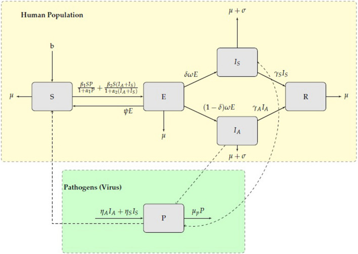 Objective: Coronavirus disease 2019 (COVID-19) is a pandemic respiratory illness spreading from person-to-person caused by a novel coronavirus and poses a serious public health risk. The goal of this study was to apply a modified susceptible-exposed-infectious-recovered (SEIR) compartmental mathematical model for prediction of COVID-19 epidemic dynamics incorporating pathogen in the environment and interventions. The next generation matrix approach was used to determine the basic reproduction number [Formula: see text]. The model equations are solved numerically using fourth and fifth order Runge-Kutta methods.
