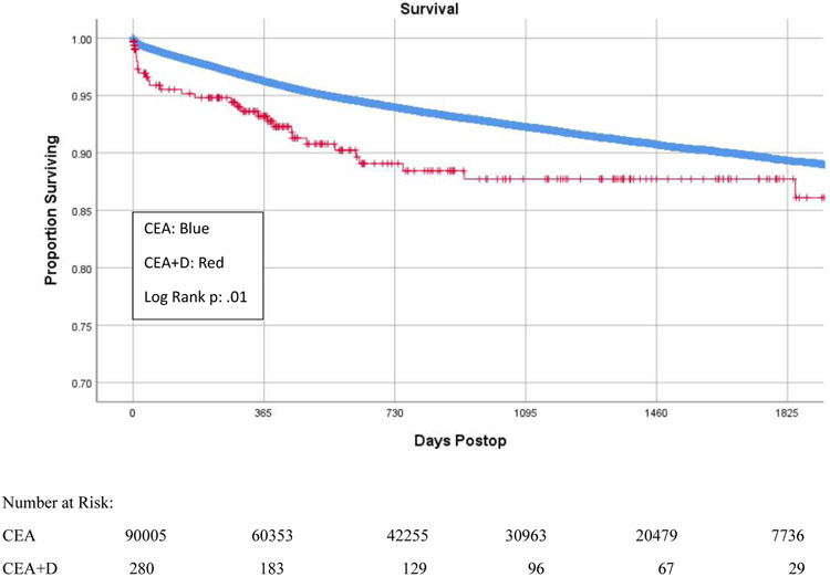 Results: From 2013 to 2019, 327 CEA+D cases were identified and compared with 105,192 isolated CEA cases. The CEA+D patients were more likely to have undergone previous ipsilateral CEA (CEA, 1.8%; CEA+D, 4.9%; P < .01) and contralateral ICA occlusion (CEA, 4.6%; CEA+D, 11.0%; P < .01) but were less likely to have had ipsilateral stenosis ≥70% (CEA, 88.3%; CEA+D, 80.6%; P < .01). The preoperative factors associated with the need for CEA+D on multivariable analysis included previous peripheral vascular intervention, American Society of Anesthesiologists class ≥4, contralateral ICA occlusion, low-volume surgeon, and previous ipsilateral CEA. CEA+D was associated with significantly increased rates of stroke in both asymptomatic (CEA+D, 3.9%; CEA, 0.9%; P < .01) and symptomatic (CEA+D, 9.4%; CEA, 1.9%; P < .01) patients. CEA+D was associated with decreased rates of 30-day survival in both asymptomatic (CEA+D, 98.3%; CEA, 99.4%; P = .02) and symptomatic (CEA+D, 94.8%; CEA, 99.1%; P < .01) cohorts. On multivariable analysis, CEA+D remained significantly associated with stroke (odds ratio, 3.17; 95% confidence interval, 1.80-5.60; P < .01). Other factors significantly associated with perioperative stroke included procedure length >135 minutes, diabetes, hypertension, shunt for indication, symptomatic status, previous ipsilateral CEA, contralateral ICA occlusion, urgent or emergent procedure, intravenous medications for hemodynamic instability, and re-exploration at the initial operation.