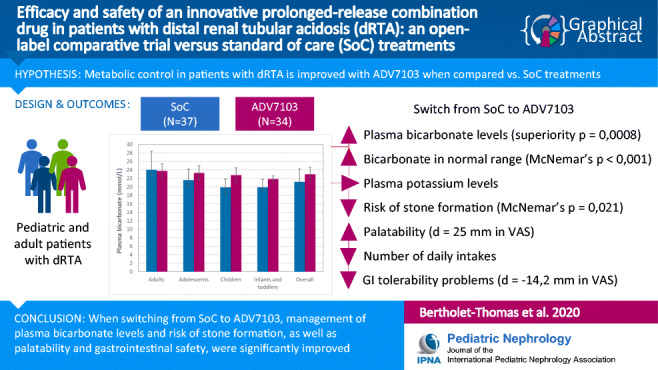 Methods: In a multicenter, open-label, non-inferiority trial (n = 37), patients with dRTA were switched from SoC to ADV7103. Mean plasma bicarbonate values and proportion of responders during steady state therapy with both treatments were compared, as were other blood and urine parameters, as well as acceptability, tolerability, and safety.