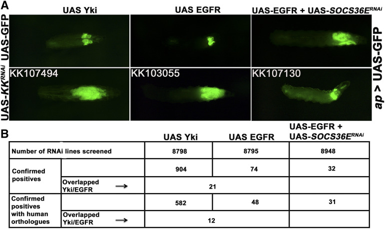 Genetic approaches in Drosophila have successfully identified many genes involved in regulation of growth control as well as genetic interactions relevant to the initiation and progression of cancer in vivo Here, we report on large-scale RNAi-based screens to identify potential tumor suppressor genes that interact with known cancer-drivers: the Epidermal Growth Factor Receptor and the Hippo pathway transcriptional cofactor Yorkie. These screens were designed to identify genes whose depletion drove tissue expressing EGFR or Yki from a state of benign overgrowth into neoplastic transformation in vivo We also report on an independent screen aimed to identify genes whose depletion suppressed formation of neoplastic tumors in an existing EGFR-dependent neoplasia model. Many of the positives identified here are known to be functional in growth control pathways. We also find a number of novel connections to Yki and EGFR driven tissue growth, mostly unique to one of the two. Thus, resources provided here would be useful to all researchers who study negative regulators of growth during development and cancer in the context of activated EGFR and/or Yki and positive regulators of growth in the context of activated EGFR. Resources reported here are available freely for anyone to use.