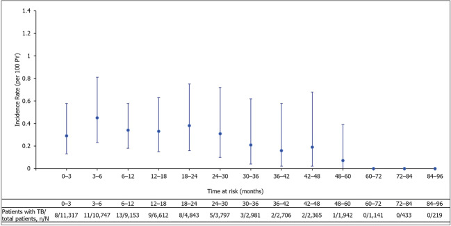 Key points: • TB rates were highest in eastern/central Europe, Mexico, and Asia-Pacific regions. • With the implementation of stricter TB screening and risk evaluations in 2007, especially in high TB incidence countries, there was a notable reduction TB occurrence. • Safety profile of biologics in real-world settings complements controlled studies. • TB and hepatitis (HBV/HCV) risk with certolizumab pegol (CZP) treatment is low.