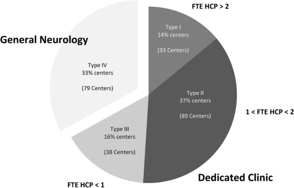 Methods: We conducted a 19-question survey using a sample of 239 headache centers (16 countries). The five-area framework identified in the parent study was confirmed and further developed by describing treatment center archetypes according to their setting (general neurology versus dedicated clinic) and resources available within the center (number of healthcare professional [HCPs] full-time-equivalent positions).