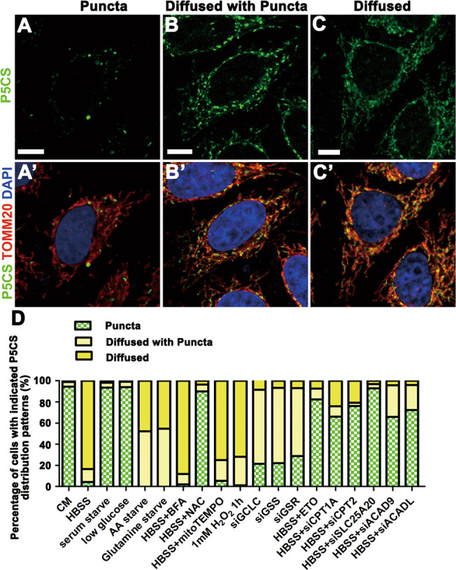 Pyrroline-5-carboxylate synthase (P5CS) catalyzes the synthesis of pyrroline-5-carboxylate (P5C), a key precursor for the synthesis of proline and ornithine. P5CS malfunction leads to multiple human diseases; however, the molecular mechanism underlying these diseases is unknown. We found that P5CS localizes in mitochondria in rod- and ring-like patterns but diffuses inside the mitochondria upon cellular starvation or exposure to oxidizing agents. Some of the human disease-related mutant forms of P5CS also exhibit diffused distribution. Multimerization (but not the catalytic activity) of P5CS regulates its localization. P5CS mutant cells have a reduced proliferation rate and are sensitive to cellular stresses. Flies lacking P5CS have reduced eclosion rates. Lipid droplets accumulate in the eyes of the newly eclosed P5CS mutant flies, which degenerate with aging. The loss of P5CS in cells leads to abnormal purine metabolism and lipid-droplet accumulation. The reduced lipid-droplet consumption is likely due to decreased expression of the fatty acid transporter, CPT1, and few β-oxidation-related genes following P5CS knockdown. Surprisingly, we found that P5CS is required for mitochondrial respiratory complex organization and that the respiration defects in P5CS knockout cells likely contribute to the metabolic defects in purine synthesis and lipid consumption. This study links amino acid synthesis with mitochondrial respiration and other key metabolic processes, whose imbalance might contribute to P5CS-related disease conditions.