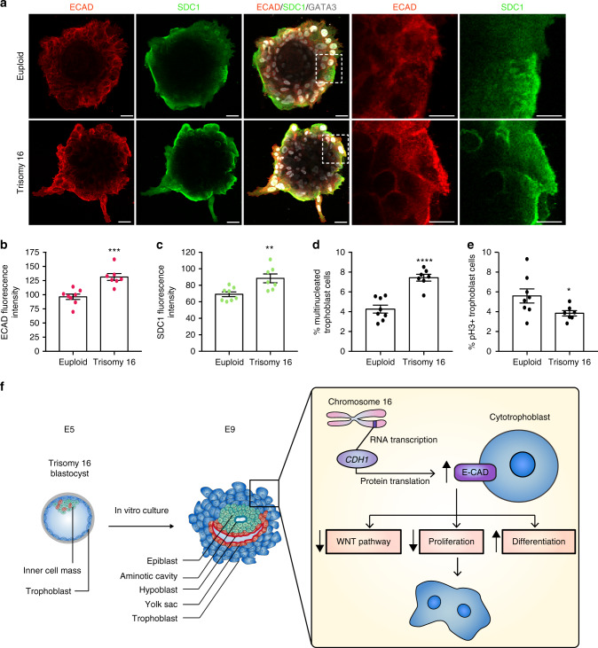 Aneuploidy, the presence of an abnormal number of chromosomes, is a major cause of early pregnancy loss in humans. Yet, the developmental consequences of specific aneuploidies remain unexplored. Here, we determine the extent of post-implantation development of human embryos bearing common aneuploidies using a recently established culture platform. We show that while trisomy 15 and trisomy 21 embryos develop similarly to euploid embryos, monosomy 21 embryos exhibit high rates of developmental arrest, and trisomy 16 embryos display a hypo-proliferation of the trophoblast, the tissue that forms the placenta. Using human trophoblast stem cells, we show that this phenotype can be mechanistically ascribed to increased levels of the cell adhesion protein E-CADHERIN, which lead to premature differentiation and cell cycle arrest. We identify three cases of mosaicism in embryos diagnosed as full aneuploid by pre-implantation genetic testing. Our results present the first detailed analysis of post-implantation development of aneuploid human embryos.