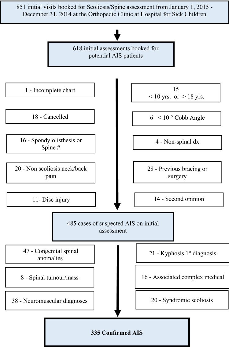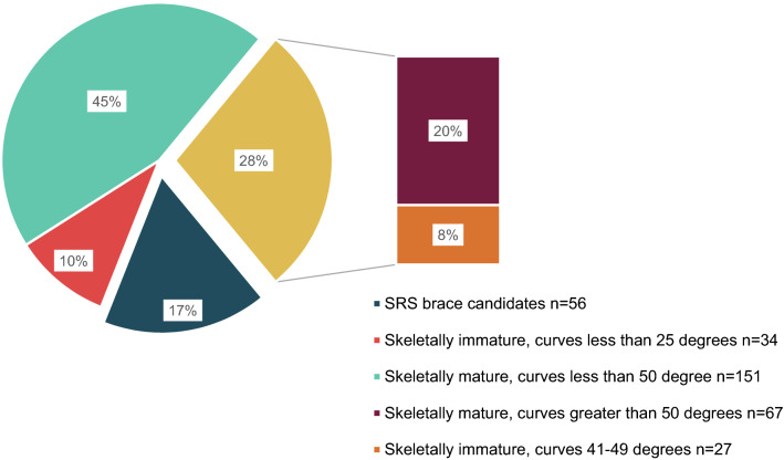 Objective: To analyze the patient demographic referred for scoliosis to the Hospital for Sick Children to determine the proportion of patients suitable for brace treatment, as per the Scoliosis Research Society guidelines. There is level 1 evidence that bracing in adolescent idiopathic scoliosis (AIS) decreases the risk of curve progression and need for surgery, but optimal brace treatment requires early curve detection.