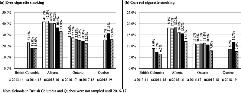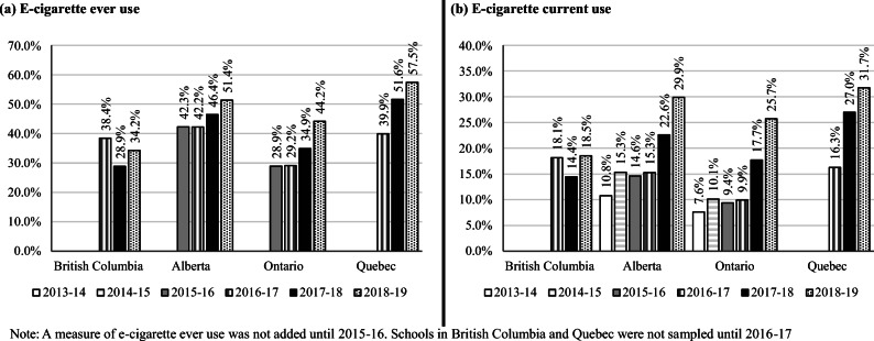 Results: The prevalence of e-cigarette ever and current use was variable across province and increased over time, particularly between 2016-2017 and 2018-2019. In contrast, the prevalence of current cigarette smoking was relatively stable over the study period, decreasing significantly in Alberta and Ontario between 2017-2018 and 2018-2019. In Ontario, the prevalence of ever and current e-cigarette use increased among all grades, both genders, and all ethnicities.