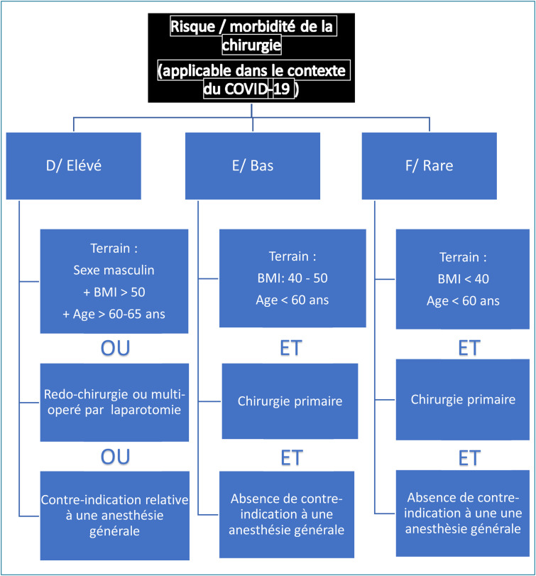 Face à l’émergence de la pandémie à COVID 19, l’activité de chirurgie bariatrique/métabolique a été arrêtée. Le confinement et l’arrêt de cette chirurgie ont eu un impact sous-estimé sur la population obèse avec prise de poids, et aggravation des comorbidités. Un certain nombre de candidats à cette chirurgie sont exposés à un risque important de mortalité liée à la pandémie. En effet, l’obésité et le diabète sont deux facteurs de risque majeurs de forme grave d’infection à COVID-19. Le seul traitement efficace actuel de l’obésité est la chirurgie métabolique avec un bénéfice rapide et durable. Il paraît donc nécessaire de reprendre une activité de chirurgie métabolique. Le but de ce travail est de hiérarchiser la reprise chirurgicale afin qu’elle soit progressive et cohérente. Les organigrammes proposés aideront les centres à déterminer les patients prioritaires selon la balance bénéfice-risque. Le diabète a une place centrale dans l’arbre décisionnel. Les modalités de reprise seront variables d’un centre à l’autre selon les ressources humaines, matérielles et médicamenteuses, et seront à adapter à l’évolution épidémique. Un consentement éclairé spécifique sera nécessaire. Un dépistage chez les patients obèses est à envisager dont les modalités de dépistage sont élaborées sur la base des connaissances disponibles. En cas de suspicion de COVID, la chirurgie doit être différée. Il faut insister sur les mesures et gestes barrières afin de protéger le patient et le personnel soignant. Un confinement est fortement suggéré pour le patient durant le premier mois postopératoire. Le suivi des patients sera effectué de préférence par téléconsultation.