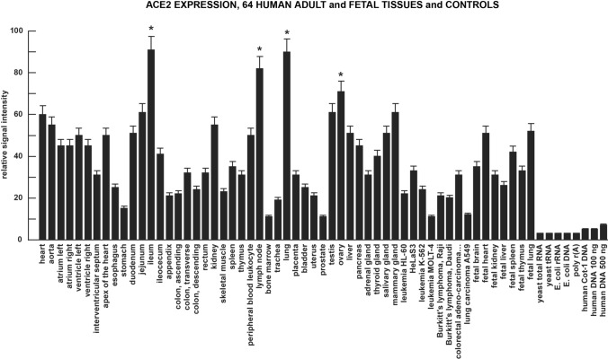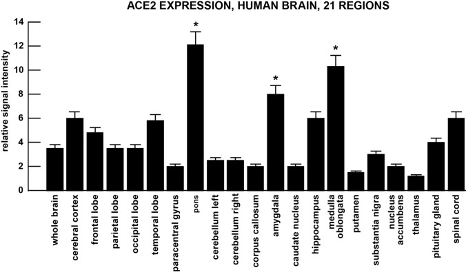 The gateway for invasion by the novel severe acute respiratory syndrome coronavirus 2 (SARS-CoV-2) into human host cells is via the angiotensin-converting enzyme 2 (ACE2) transmembrane receptor expressed in multiple immune and nonimmune cell types. SARS-CoV-2, that causes coronavirus disease 2019 (COVID-19; CoV-19) has the unusual capacity to attack many different types of human host cells simultaneously via novel clathrin- and caveolae-independent endocytic pathways, becoming injurious to diverse cells, tissues and organ systems and exploiting any immune weakness in the host. The elicitation of this multipronged attack explains in part the severity and extensive variety of signs and symptoms observed in CoV-19 patients. To further our understanding of the mechanism and pathways of SARS-CoV-2 infection and susceptibility of specific cell- and tissue-types and organ systems to SARS-CoV-2 attack in this communication we analyzed ACE2 expression in 85 human tissues including 21 different brain regions, 7 fetal tissues and 8 controls. Besides strong ACE2 expression in respiratory, digestive, renal-excretory and reproductive cells, high ACE2 expression was also found in the amygdala, cerebral cortex and brainstem. The highest ACE2 expression level was found in the pons and medulla oblongata in the human brainstem, containing the medullary respiratory centers of the brain, and may in part explain the susceptibility of many CoV-19 patients to severe respiratory distress.