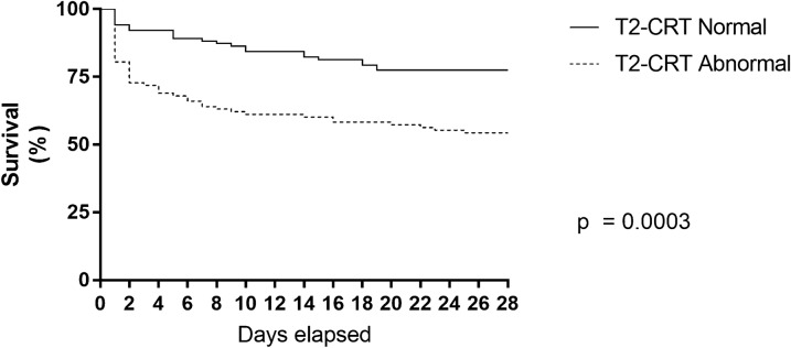 Results: Patients randomized to the lactate arm at T0, evolving with normal CRT at T2 exhibited significantly higher mortality than patients with normal CRT at T2 initially allocated to CRT (40 vs 23%, p = 0.009). These results replicated at T8 and T24. LT arm received significantly more resuscitative interventions (fluid boluses: 1000[500-2000] vs. 500[0-1500], p = 0.004; norepinephrine test in previously hypertensive patients: 43 (35) vs. 19 (19), p = 0.001; and inodilators: 16 (13) vs. 3 (3), p = 0.003). A multivariate logistic regression of patients with normal CRT at T2, including APACHE-II, baseline lactate, cumulative fluids administered since emergency admission, source of infection, and randomization group) confirmed that allocation to LT group was a statistically significant determinant of 28-day mortality (OR 3.3; 95%CI[1.5-7.1]); p = 0.003).