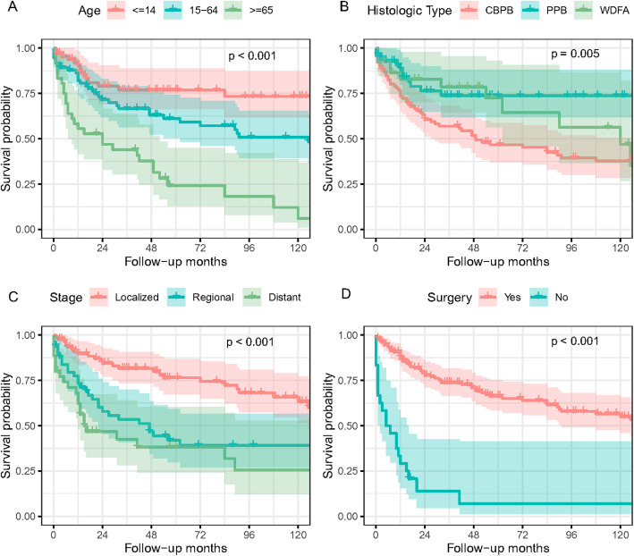Results: We identified 177 PB patients with a median survival of 108 months. The 5 and 10-year survival rate in all PB patients were 58.2 and 48.5%, as well as the 5 and 10-year disease-specific mortality were 33.5 and 38.6%. No sex or race disparities in incidence and prognosis was observed. The death risk of PB was significantly associated with age at diagnosis, clinical stage, histologic subtype and surgery treatment (p<0.01). On multivariable regression analyses, older age, regional stage and no surgery predicted higher risk of both all-cause and disease-specific death in PB patients.