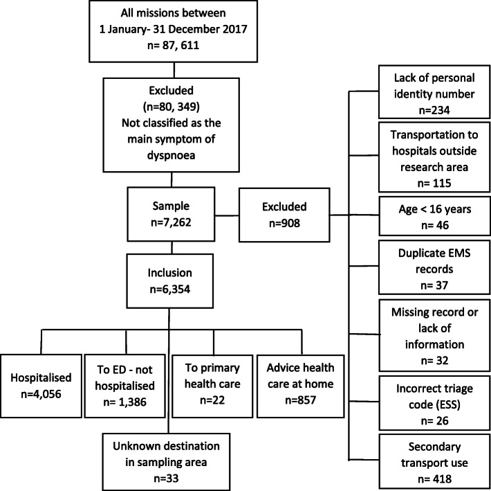 Methods: This retrospective observational study included patients aged > 16 years whose main symptom was dyspnoea. All the enrolled patients were assessed in the south-western part of Sweden by PENs during January and December, 2017. Of 7260 assignments (9% of all primary missions), 6354 fulfilled the inclusion criteria. Analysis was performed using descriptive statistics, and the tests used were odds ratios and Kaplan-Meier analysis.
