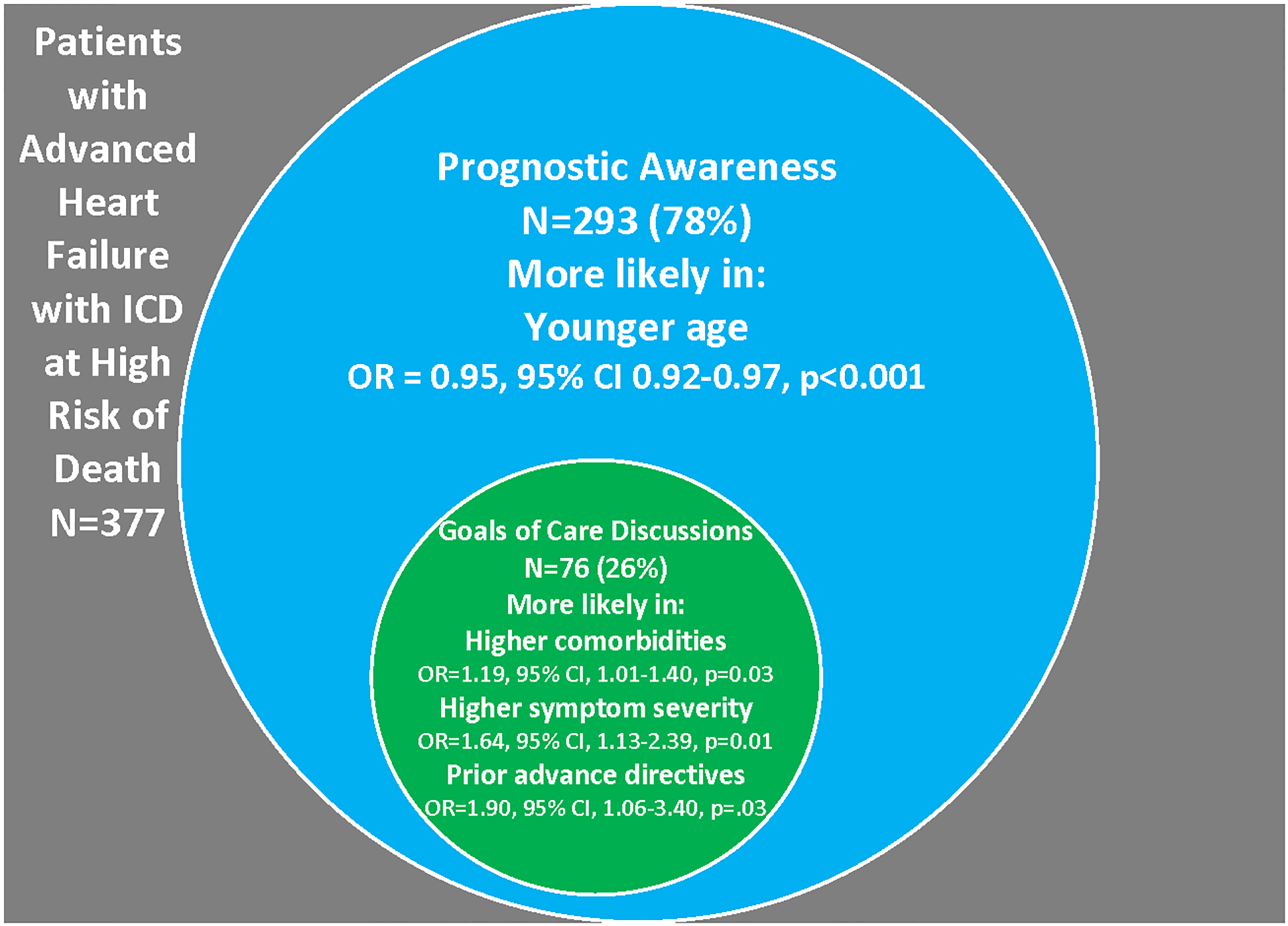 Results: Of 377 patients (mean age 62 years, 30% female, 42% nonwhite), 78% had PA. Increasing age was a negative predictor of PA (odds ratio, 0.95 [95% CI, 0.92-0.97]; P<0.01). No other patient characteristics were associated with PA. Of those with PA, 26% had a GOCD. Higher comorbidities and prior advance directives were associated with GOCD but were of only borderline statistical significance in a fully adjusted model. Symptom severity (odds ratio, 1.77 [95% CI, 1.19-2.64]; P=0.005) remained a robust and statistically significant positive predictor of having a GOCD in the fully adjusted model.