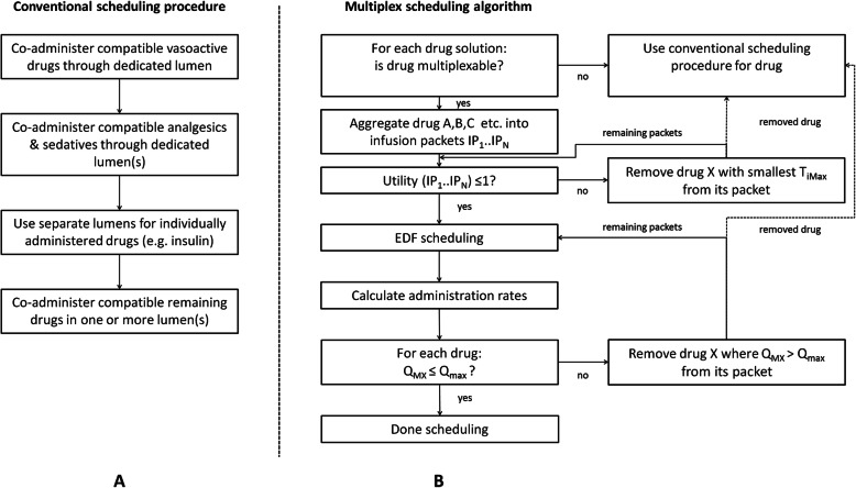 Conclusion: The multiplex algorithm addresses a major issue that occurs in ICUs, operating rooms, oncology wards, and many other hospital departments where several incompatible drugs are infused through a restricted number of lumens. The multiplex algorithm allows for more efficient use of IV lumens compared to the conventional multi-infusion strategy.