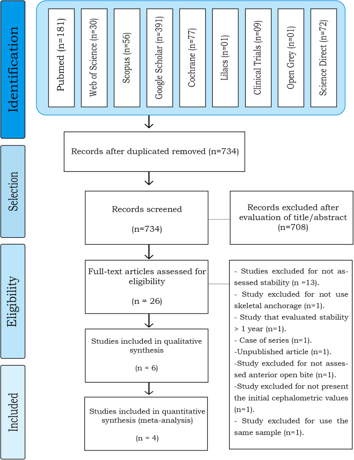 Objectives: The aim of this systematic review and meta-analysis is to assess the degree of stability of anterior open bite (AOB) treatment performed through the molar intrusion supported with skeletal anchorage at least 1 year posttreatment.