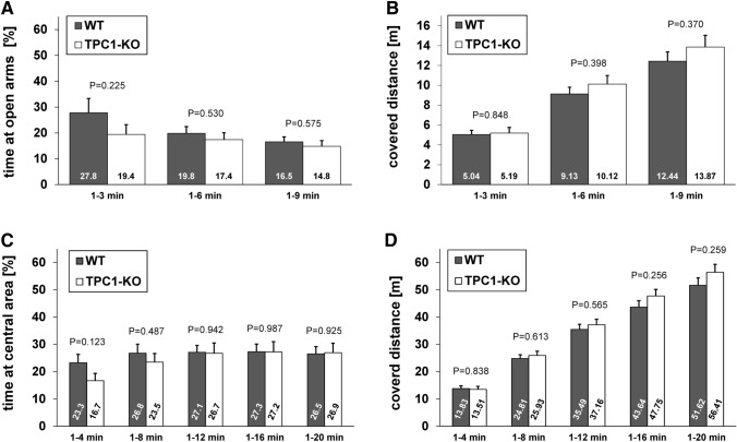 Two-pore channels (TPCs) constitute a small family of cation channels that are localized in membranes of endosomal and lysosomal compartments. Although their roles for vesicular fusion and endolysosomal trafficking have been investigated, our knowledge on their expression pattern and higher order functions in the murine brain is still limited. Western blot analysis indicated a broad expression of TPC1 in the neocortex, cerebellum and hippocampus. In order to investigate the consequences of the genetic inactivation of TPC1, we performed a set of behavioural studies with TPC1-/- mice. TPC1-/- mice were analysed for an altered motor coordination and grip-strength, exploratory drive and anxiety as well as learning and memory. TPC1-/- mice did not show any differences in their exploratory drive or in their anxiety levels. There were also no differences in spontaneous activity or motor performance. However, the Morris water maze test uncovered a deficit in spatial learning and memory in TPC1-/- mice.