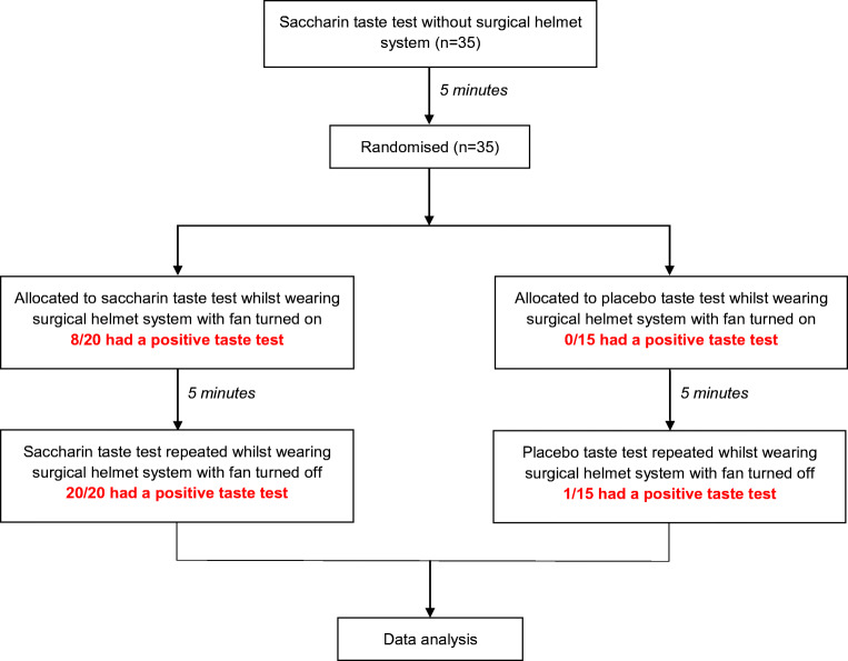 Methods: Thirty-five participants were enrolled in a double-blinded randomised controlled study investigating efficacy of the Stryker Flyte Surgical Helmet (Stryker Corporation, Kalamazoo, MI, USA) as protection against respiratory droplets. Wearing the SSHS in a fit testing hood, subjects were randomised to nebulised saccharin solution or placebo. Twenty were allocated to the saccharin group with 15 to placebo. Positive sweet taste represented a failure of the test. Taste tests were performed with the helmet fan turned on and off.