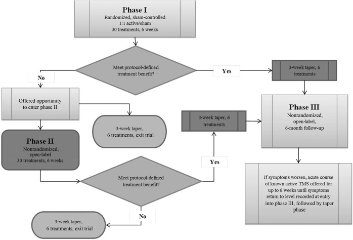 Treatment-resistant depression (TRD) is prevalent and associated with a substantial psychosocial burden and mortality. There are few prior studies of interventions for TRD in adolescents. This was the largest study to date examining the feasibility, safety, and efficacy of 10-Hz transcranial magnetic stimulation (TMS) for adolescents with TRD. Adolescents with TRD (aged 12-21 years) were enrolled in a randomized, sham-controlled trial of TMS across 13 sites. Treatment resistance was defined as an antidepressant treatment record level of 1 to 4 in a current episode of depression. Intention-to-treat patients (n = 103) included those randomly assigned to active NeuroStar TMS monotherapy (n = 48) or sham TMS (n = 55) for 30 daily treatments over 6 weeks. The primary outcome measure was change in the Hamilton Depression Rating Scale (HAM-D-24) score. After 6 weeks of blinded treatment, improvement in the least-squares mean (SE) HAM-D-24 scores were similar between the active (-11.1 [2.03]) and sham groups (-10.6 [2.00]; P = 0.8; difference [95% CI], - 0.5 [-4.2 to 3.3]). Response rates were 41.7% in the active group and 36.4% in the sham group (P = 0.6). Remission rates were 29.2% in the active group and 29.0% in the sham group (P = 0.95). There were no new tolerability or safety signals in adolescents. Although TMS treatment produced a clinically meaningful change in depressive symptom severity, this did not differ from sham treatment. Future studies should focus on strategies to reduce the placebo response and examine the optimal dosing of TMS for adolescents with TRD.