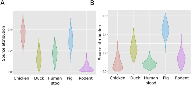 Results: Among 672 NTS isolates, 148 (22%) originated from human blood, 211 (31%) from human stool, and 313 (47%) from animal stool. The distribution of serovars, STs, and AMR profiles differed among sources; serovars Enteritidis, Typhimurium, and Weltevreden were the most common in human blood, human stool, and animals, respectively. We identified an association between the source of NTS and AMR profile; the majority of AMR isolates were isolated from human blood (p < 0.001). Modelling by ST-AMR profile found chickens and pigs were likely the major sources of AMR NTS in human blood and stool, respectively; but unsampled sources were found to be a major contributor.