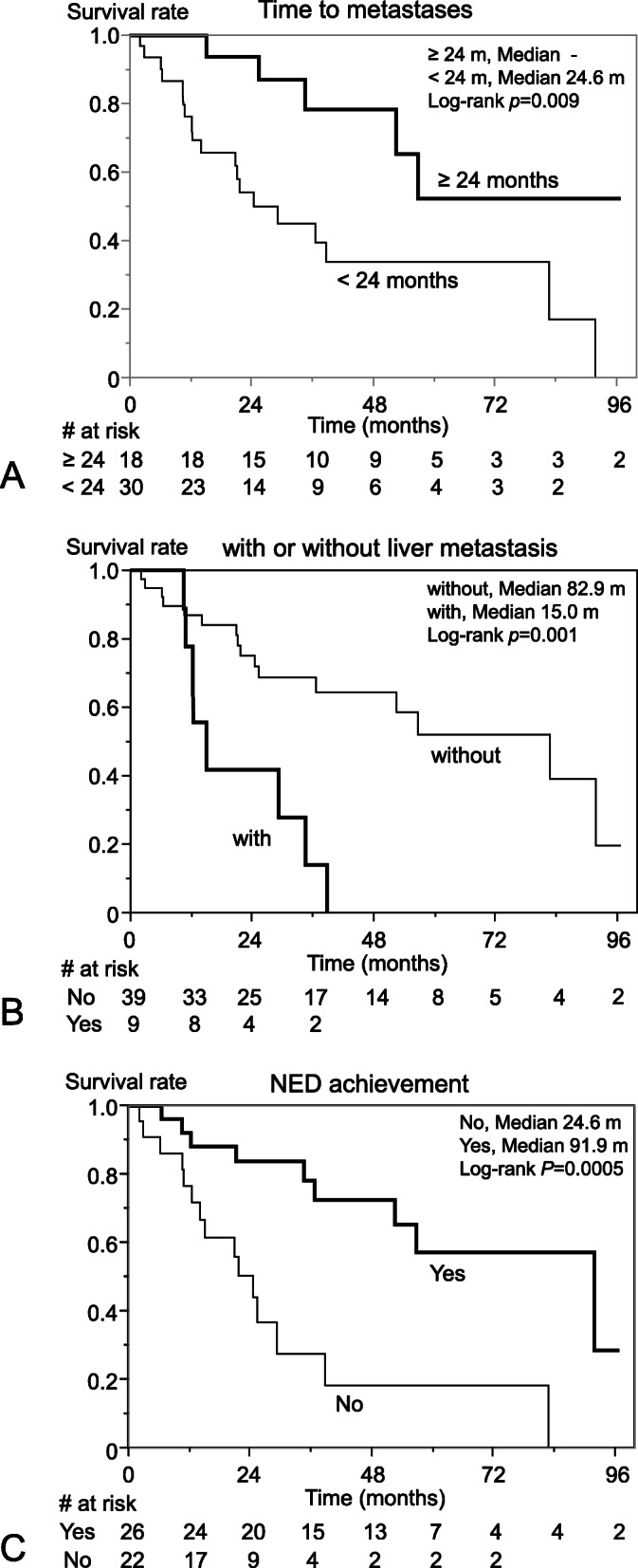 Results: Lung metastases were detected in nine patients (18.8%) and extrapulmonary metastases in 45 (93.8%). Interval from primary diagnosis to the first metastasis was significantly shorter in patients with lung metastases than without (p = 0.007). Median disease-specific survival after diagnosis of metastases was 52.5 months in all patients. In multivariable analysis, liver metastasis (hazard ratio (HR), 2.71 [95% confidence interval (CI), 1.00-7.09]) and no evidence of disease (NED) achieved by radical treatment (resection with or without radiation therapy, or radiation therapy ≥60 Gy) or semi-radical (radiation therapy ≥40 Gy) treatment were significantly related to survival (HR, 0.36; 95%CI [0.13-0.95]). The number of metastases (odds ratio (OR), 0.44; 95%CI [0.25-0.78]) and abdominal/retroperitoneal metastases (OR, 0.09; 95%CI [0.008-0.95]) were the significant inhibitory factors of achieving NED.
