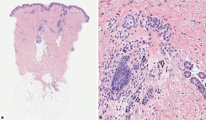 Wir berichten über ein 20 Monate altes Mädchen mit teils anulären, urtikariellen Hautveränderungen am gesamten Integument, die bis zu 1 Woche persistierten und dann an neuen Stellen auftraten. Die histologische Aufarbeitung zeigte ein urtikarielles Entzündungsmuster mit interstitiellem Ödem und einem Infiltrat mit Lymphozyten, Neutrophilen und vielen eosinophilen Granulozyten ohne Flammenfiguren. Das Labor war unauffällig. In Zusammenschau stellten wir die Diagnose eines eosinophilen anulären Erythems (EAE) im Kindesalter, das zu den eosinophilen Dermatosen zählt.