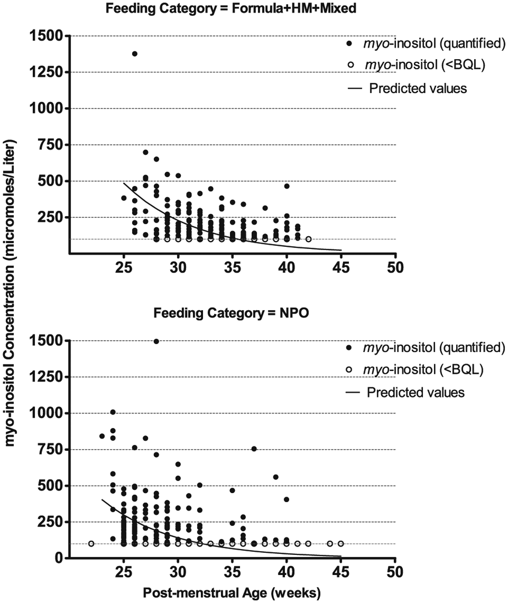 Results: In 441 samples obtained from 281 infants, myo-inositol concentrations varied from nondetectable to 1494 μmol/L. Cord myo-inositol concentrations decreased an estimated 11.9% per week increase in GA. Postnatal myo-inositol concentrations decreased an estimated 14.3% per week increase in postmenstrual age (PMA) and were higher for enterally fed infants compared to unfed infants (51% increase for fed vs. unfed infants).