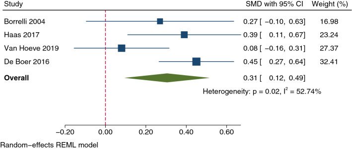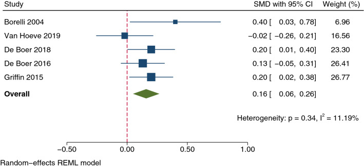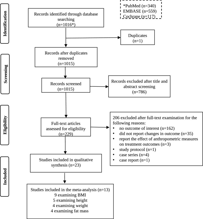 Results: In total, 23 cohort studies (total 1167 participants) met the inclusion criteria. Meta-analysis was performed on 13 of these studies. In children, 6-29.3 months of anti-TNFα therapy had a small but statistically significant effect on weight (SMD 0.31; 95% confidence interval [CI] 0.12-0.49; P = 0.001) with a mean gain in z score of 0.30 (standard error [SE] 0.12). In adults, 2-22.4 months of treatment had a moderate effect on BMI (SMD 0.72; 95% CI 0.17-1.26; P = 0.010; mean gain 1.23 kg/m2; SE 0.21). A small but statistically significant increase in BMI z score was found in children (SMD 0.28; 95% CI 0.03-0.53; P = 0.026; mean change 0.31 ± standard deviation [SD] 0.14) after 12-29.3 months of therapy. A meta-analysis of four studies found a negligible but statistically significant increase in height (SMD 0.16; 95% CI 0.06-0.26; P = 0.002; mean change 0.17 z score [SE 0.05]). A negligible effect on fat mass (SMD 0.24; 95% CI -0.19-0.66; P = 0.272) was found in a meta-analysis of five studies. Of note, despite the high heterogeneity among the studies that addressed the issue, these results were also consistently supported by findings from studies not included in the meta-analysis and reviewed in the systematic review. Unfortunately, a lack of data meant we were unable to perform moderator analysis on observed heterogeneity.