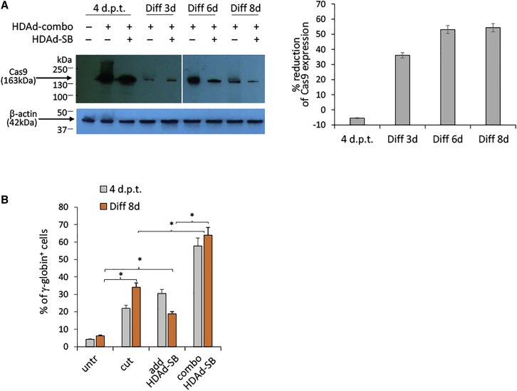 We have recently reported that, after in vivo hematopoietic stem cell/progenitor (HSPC) transduction with HDAd5/35++ vectors, SB100x transposase-mediated γ-globin gene addition achieved 10%-15% γ-globin of adult mouse globin, resulting in significant but incomplete phenotypic correction in a thalassemia intermedia mouse model. Furthermore, genome editing of a γ-globin repressor binding site within the γ-globin promoter by CRISPR-Cas9 results in efficient reactivation of endogenous γ-globin. Here, we aimed to combine these two mechanisms to obtain curative levels of γ-globin after in vivo HSPC transduction. We generated a HDAd5/35++ adenovirus vector (HDAd-combo) containing both modules and tested it in vitro and after in vivo HSPC transduction in healthy CD46/β-YAC mice and in a sickle cell disease mouse model (CD46/Townes). Compared to HDAd vectors containing either the γ-globin addition or the CRISPR-Cas9 reactivation units alone, in vivo HSC transduction of CD46/Townes mice with the HDAd-combo resulted in significantly higher γ-globin in red blood cells, reaching 30% of that of adult human α and βS chains and a complete phenotypic correction of sickle cell disease.