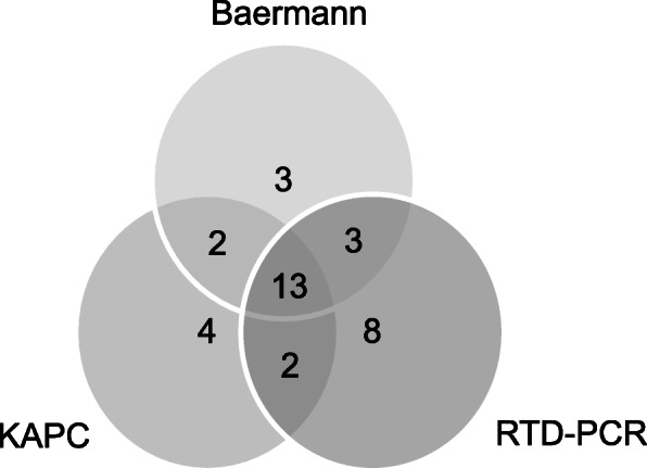 Results: The overall prevalence of S. stercoralis infections among the study population was 33.4%. The cumulative infection prevalence statistically significantly increased from the lowest age group of 40 years and below (22.4%), to the medium (40.0%) and to the oldest age group of 61 year and above (72.7%)(P = 0.003). The cumulative infection prevalence of CRS was considerably higher in male (40.4%) compared to female patients (28.1%), but not statistically different (P = 0.184). The diagnostic sensitivity of Baermann technique, KAPC, RTD-PCR, and the combination of Baermann technique and KAPC were 60.0, 60.0, 74.3, and 77.1%, respectively. Only 13 patients (37.1%) of the total 35 S. stercoralis patients diagnosed with any technique had a simultaneously positive diagnostic test with Baermann, KAPC and RTD-PCR.