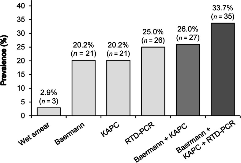 Methods: Between September and December 2018, stool samples of 104 inpatients were investigated for S. stercoralis infection by wet smear, Baermann technique, Koga Agar plate culture (KAPC), and real-time detection polymerase chain reaction (RTD-PCR) at the Infectious Diseases Ward of the Mahosot Hospital in Vientiane. The sensitivity, the specificity, the negative predictive value (NPV) of each diagnostic test, as well as their combination(s) was calculated using a composite reference standard (CRS). The correlation of the different test methods was assessed by chi-square or Fisher's exact test. Cohen's kappa coefficient was used to assess the diagnostic agreement of the different test methods.