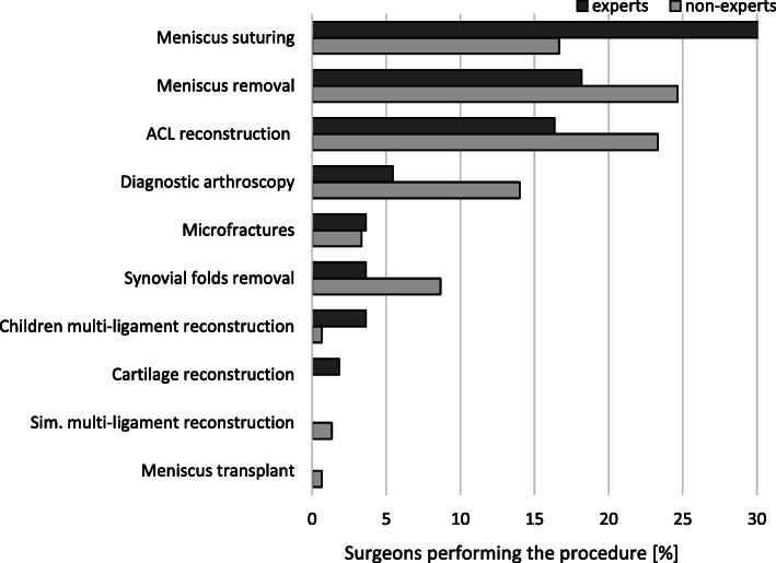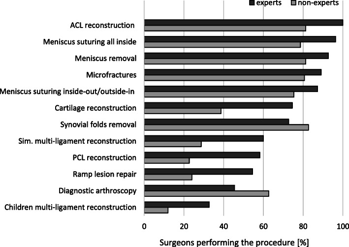 Methods: A total of 205 registered orthopaedic surgeons participated in the surveys. The survey consisted of 35 questions regarding general arthroscopy and postoperative management, including physicians' level of expertise, anaesthesia, postoperative treatment, rehabilitation and procedures performed. Comparisons were made between knee arthroscopy experts (> 100 arthroscopies performed per year) and non-experts (≤ 100 cases) on aspects of patient care.