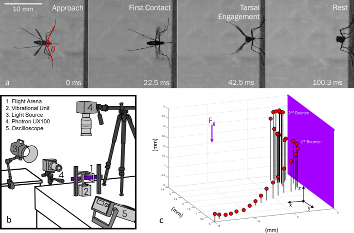 In this experimental study we film the landings of Aedes aegypti mosquitoes to characterize landing behaviors and kinetics, limitations, and the passive physiological mechanics they employ to land on a vertical surface. A typical landing involves 1-2 bounces, reducing inbound momentum by more than half before the mosquito firmly attaches to a surface. Mosquitoes initially approach landing surfaces at 0.1-0.6 m/s, decelerating to zero velocity in approximately 5 ms at accelerations as high as 5.5 gravities. Unlike Dipteran relatives, mosquitoes do not visibly prepare for landing with leg adjustments or body pitching. Instead mosquitoes rely on damping by deforming two forelimbs and buckling of the proboscis, which also serves to distribute the impact force, lessening the potential of detection by a mammalian host. The rebound response of a landing mosquito is well-characterized by a passive mass-spring-damper model which permits the calculation of force across impact velocity. The landing force of the average mosquito in our study is approximately 40 [Formula: see text]N corresponding to an impact velocity of 0.24 m/s. The substrate contact velocity which produces a force perceptible to humans, 0.42 m/s, is above 85% of experimentally observed landing speeds.