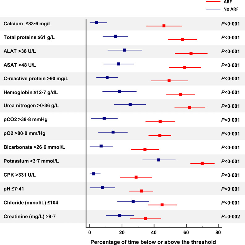 Findings: On the 162 studied patients, 1151 biochemical explorations were carried out for up to 59 biochemical markers, totaling 15,260 biochemical values. The spectrum of biochemical abnormalities and their kinetics were consistent with a multi-organ involvement, including lung, kidney, heart, liver, muscle, and pancreas, along with a severe inflammatory syndrome. The proportion of patients who developed an acute kidney injury (AKI) stage 3, increased significantly during follow-up (0·9%, day 0; 21·4%, day 14; P<0·001). On the 20 more representative biochemical markers (>250 iterations), only CRP >90 mg/L (odds ratio [OR] 6·87, 95% CI, 2·36-20·01) and urea nitrogen >0·36 g/L (OR 3·91, 95% CI, 1·15-13·29) were independently associated with the risk of ARF. Urea nitrogen >0·42 g/L was the only marker associated with the risk of COVID-19 related death.