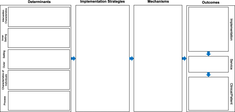 Background: Numerous models, frameworks, and theories exist for specific aspects of implementation research, including for determinants, strategies, and outcomes. However, implementation research projects often fail to provide a coherent rationale or justification for how these aspects are selected and tested in relation to one another. Despite this need to better specify the conceptual linkages between the core elements involved in projects, few tools or methods have been developed to aid in this task. The Implementation Research Logic Model (IRLM) was created for this purpose and to enhance the rigor and transparency of describing the often-complex processes of improving the adoption of evidence-based interventions in healthcare delivery systems.