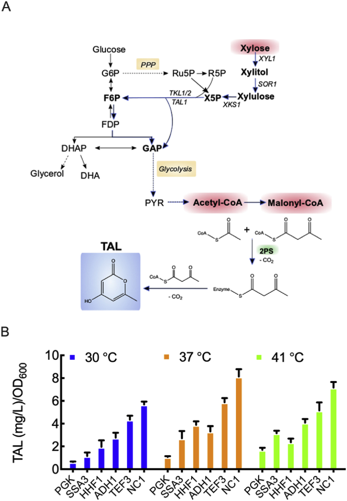 Kluyveromyces marxianus is an emerging host for metabolic engineering. This thermotolerant yeast is the fastest growing eukaryote, has high flux through the TCA cycle, and can metabolize a broad range of C5, C6, and C12 carbon sources. In comparison to the common host Saccharomyces cerevisiae, this non-conventional yeast suffers from a lack of metabolic engineering tools to control gene expression over a wide transcriptional range. To address this issue, we designed a library of 25 native-derived promoters from K. marxanius CBS6556 that spans 87-fold transcriptional strength under glucose metabolism. Six promoters from the library were further characterized in both glucose and xylose as well as across various temperatures from 30 to 45 °C. The temperature study revealed that in most cases EGFP expression decreased with elevating temperature; however, two promoters, P SSA3 and P ADH1 , increased expression above 40 °C in both xylose and glucose. The six-promoter set was also validated in xylose for triacetic acid lactone (TAL) production. By controlling the expression level of heterologous 2-pyrone synthase (2-PS), the specific TAL titer increased over 8-fold at 37 °C. Cultures at 41 °C exhibited a similar TAL biosynthesis capability, while at 30 °C TAL levels were lower. Taken together, these results advance the metabolic engineering tool set in K. marxianus and further develop this new host for chemical biosynthesis.