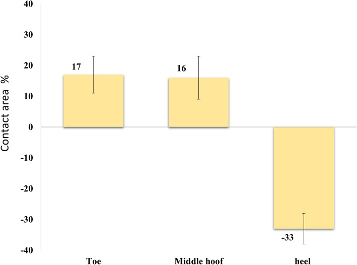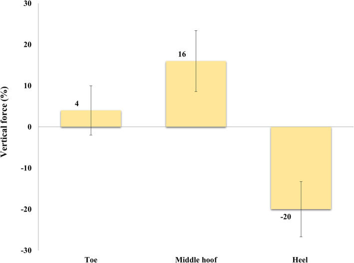 Results: The VF and CA were higher in the heel region (63 and 61%, respectively) and decreased significantly after removal of the HCHW (43 and 28% after removal, respectively). The breakover phase in horses with HCHW lasted 2% of stance phase and was significantly shorter than that in BFC, which lasted 6% of stance phase. The VF at onset of breakover for the toe region in horses with HCHW was significantly lower than that in BFC. The centre of the force was located at the heel region in all horses with the HCHW, and at the middle the hoof region in BFC.