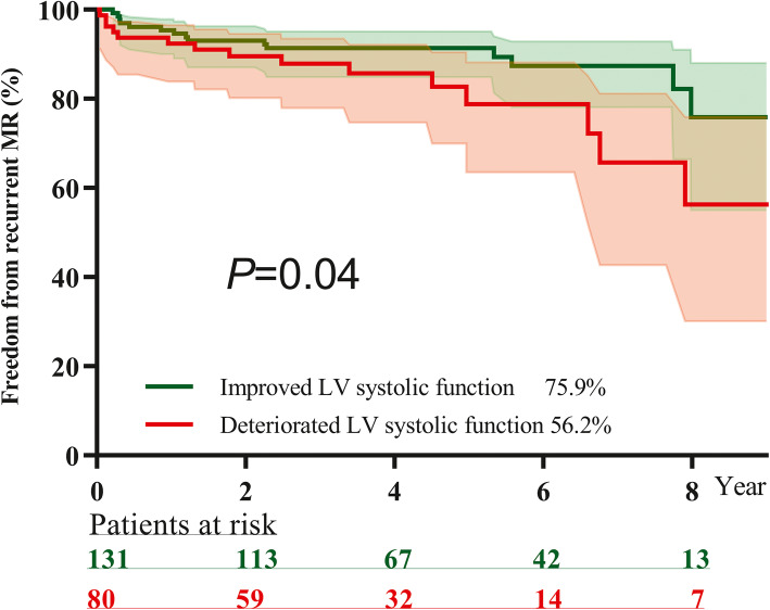 Results: The in-hospital mortality rate was 1.6%. The rate of eight-year overall survival, freedom from reoperation for mitral valve and freedom from recurrent MR were 96.9, 91.2 and 73.4%, respectively. Intraoperative residual mild MR (hazard ratio 4.82) and an isolated anterior leaflet lesion (hazard ratio 2.48) were independent predictive factors for recurrent MR. During follow-up, 212 patients underwent echocardiography examinations at our institution. Among them, 132 patients had improved left ventricular systolic function, and 80 patients had deteriorated left ventricular systolic. Freedom from recurrent MR was found in 75.9% of the improved left ventricular systolic function group and 56.2% of the deteriorated left ventricular systolic function group (P = 0.047). An age > 50 years (odds ratio 2.40), ejection fraction≤52% (odds ratio 2.79) and left ventricular end-systolic dimension≥45 mm (odds ratio 2.31) were independent risk factors for deteriorated left ventricular systolic function during follow-up.