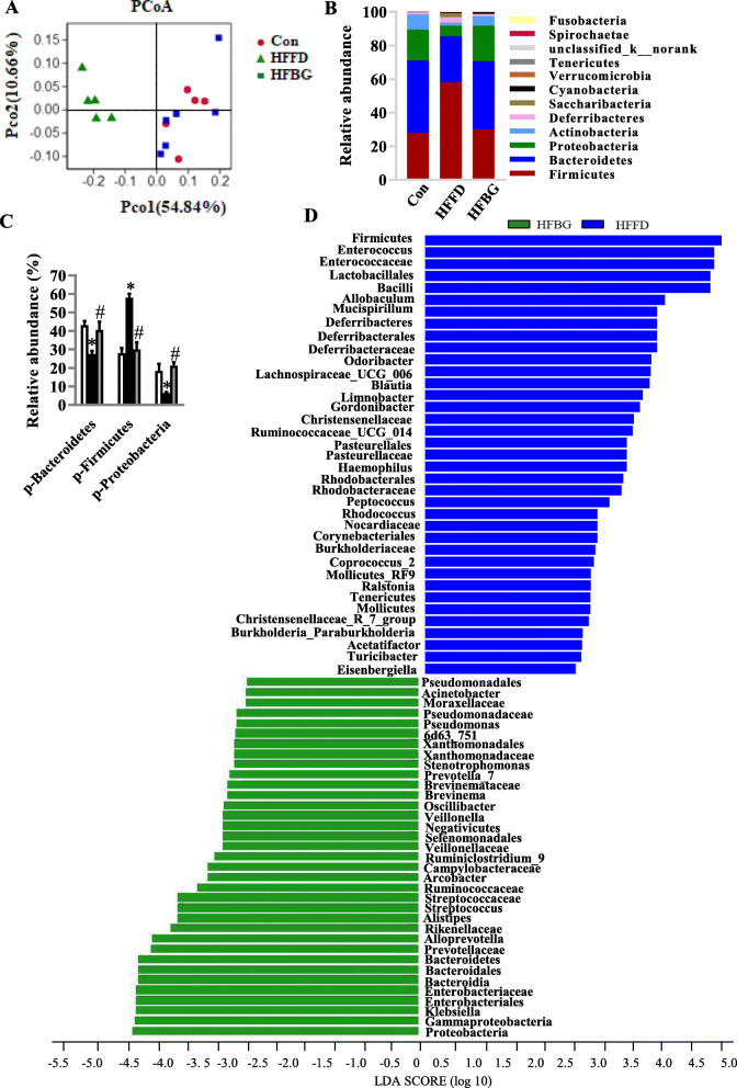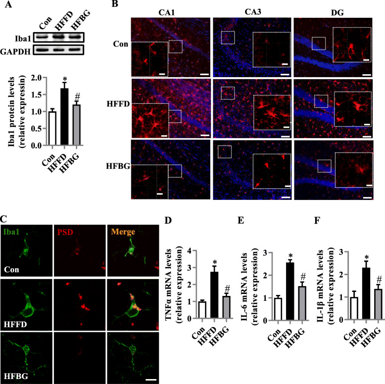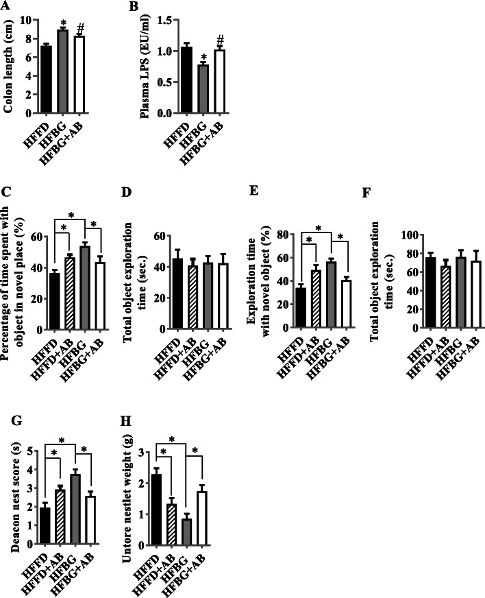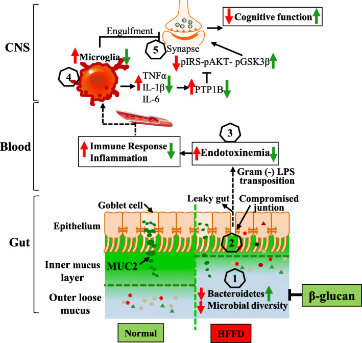 Results: After long-term supplementation for 15 weeks, β-glucan prevented HFFD-induced cognitive impairment assessed behaviorally by object location, novel object recognition, and nesting building tests. In the hippocampus, β-glucan countered the HFFD-induced microglia activation and its engulfment of synaptic puncta, and upregulation of proinflammatory cytokine (TNF-α, IL-1β, and IL-6) mRNA expression. Also, in the hippocampus, β-glucan significantly promoted PTP1B-IRS-pAKT-pGSK3β-pTau signaling for synaptogenesis, improved the synaptic ultrastructure examined by transmission electron microscopy, and increased both pre- and postsynaptic protein levels compared to the HFFD-treated group. In the colon, β-glucan reversed HFFD-induced gut barrier dysfunction increased the thickness of colonic mucus (Alcian blue and mucin-2 glycoprotein immunofluorescence staining), increased the levels of tight junction proteins occludin and zonula occludens-1, and attenuated bacterial endotoxin translocation. The HFFD resulted in microbiota alteration, effects abrogated by long-term β-glucan supplementation, with the β-glucan effects on Bacteroidetes and its lower taxa particularly striking. Importantly, the study of short-term β-glucan supplementation for 7 days demonstrated pronounced, rapid differentiating microbiota changes before the cognitive improvement, suggesting the possible causality of gut microbiota profile on cognition. In support, broad-spectrum antibiotic intervention abrogated β-glucan's effects on improving cognition, highlighting the role of gut microbiota to mediate cognitive behavior.