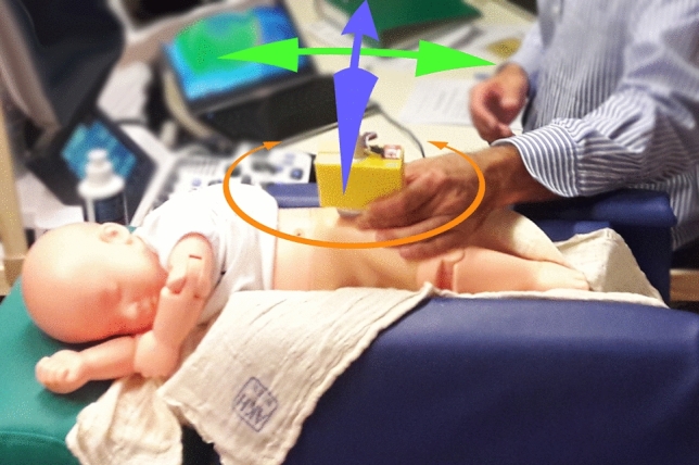 To develop an electronic navigation system to increase reliability and comparability in the ultrasound screening of developmental dysplasia of the hip (DDH). The impact of the navigation system on transducer positioning and on sonographic measurements according to Graf was analyzed. Twenty hips in newborns were examined sonographically using a new navigation system capable of detecting the transducer and pelvis position in order to calculate the relative tilt in the frontal, axial, and sagittal-plane. In each newborn an ultrasound image was obtained conventionally according to Graf and a second image using the sonographic navigation system. Relative roll and pitch angles and sonographic measurements were analyzed using paired T-tests and Levene-tests. Relative tilt angles in the conventional group ranged from - 8.9° to 14.3° (frontal-plane) and - 23.8° to 14.2° (axial-plane). In the navigation-assisted group ranges from - 3.0° to 3.5° and - 2.8° to 4.5° were observed. Variances were significantly lower in the navigation-assisted group (p < 0.001 and p = 0.004 respectively). The navigation system allowed for a significant reduction of relative tilt angles between the transducer and the newborn pelvis, thus supporting an optimal transducer positioning. This is a promising approach to improve reproducibility and reliability in the ultrasound screening for DDH.