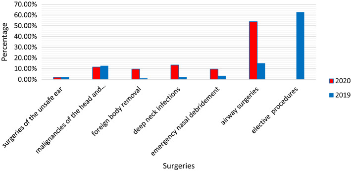 Corona virus disease (COVID 19) is an infectious respiratory disease caused by the novel virus severe acute respiratory syndrome coronavirus 2 (SARS-CoV-2). With many countries implementing lockdown the surgical activities in the division of otolaryngology across the world has been affected with many hospital confining themselves to only emergency or essential surgeries. The aim of this work is to report and discuss the in the surgical activity of the otolaryngology unit of the St John's National Academy of Health Sciences, Bangalore (India) during the pandemic. We performed acute and subacute emergencies which include diagnosis and treatment of malignant tumors of the head and neck, management of airway emergencies in adults and children, drainage of abscesses of the head and neck, Foreign body removal, emergency nasal debridement and surgeries for the unsafe ear. With the pandemic the surgical activities in otolaryngology changed drastically and with strict protocol and triaging put in place the risk for Health care workers was avoided and services to patients delivered.