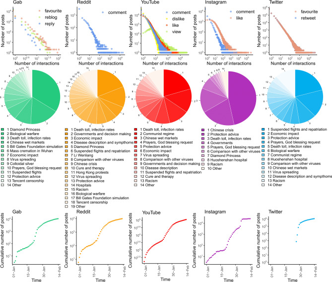 We address the diffusion of information about the COVID-19 with a massive data analysis on Twitter, Instagram, YouTube, Reddit and Gab. We analyze engagement and interest in the COVID-19 topic and provide a differential assessment on the evolution of the discourse on a global scale for each platform and their users. We fit information spreading with epidemic models characterizing the basic reproduction number [Formula: see text] for each social media platform. Moreover, we identify information spreading from questionable sources, finding different volumes of misinformation in each platform. However, information from both reliable and questionable sources do not present different spreading patterns. Finally, we provide platform-dependent numerical estimates of rumors' amplification.