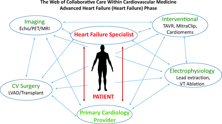 In this document, we outline the challenges faced by patients and clinicians in heart failure, specifically centered around the needed coordination of care among the various subspecialties within cardiovascular medicine. We call for a more organized and collaborative effort among clinicians in primary care, general cardiology, electrophysiology, interventional cardiology, cardiothoracic surgery, cardiac imaging, and heart failure-all caring for mutual patients. Care is contextualized within the framework of two phases: a cardiomyopathy phase and an advanced heart failure phase, each of which lends to different considerations in therapy. Ultimately multidisciplinary coordinated care within cardiovascular medicine may lead to greater patient and clinician satisfaction as well as improved outcomes, but this remains to be investigated.