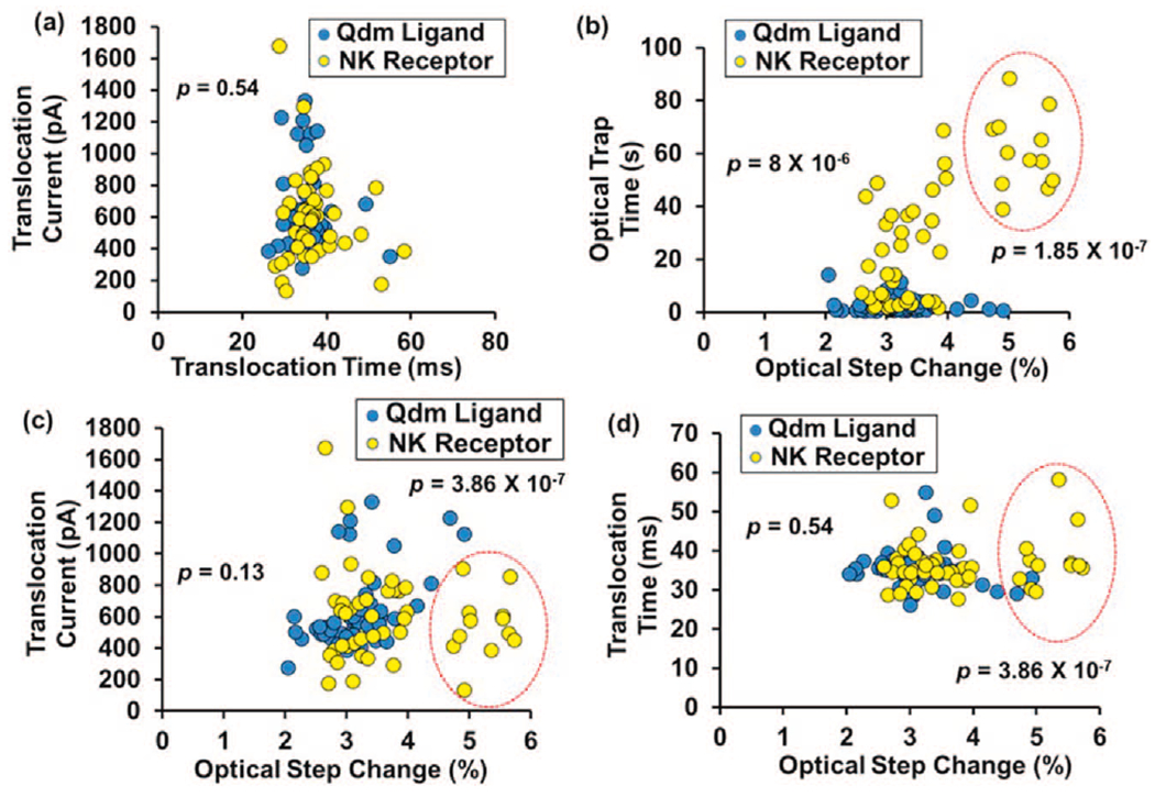 A plasmonic nanopore sensor enabling detection of bimodal optical and electrical molecular signatures was fabricated and tested for its ability to characterize low affinity ligand-receptor interactions. This plasmonic nanosensor uses self-induced back-action (SIBA) for optical trapping to enable SIBA-actuated nanopore electrophoresis (SANE) through a nanopore located immediately below the optical trap volume. A natural killer (NK) cell inhibitory receptor heterodimer molecule CD94/NKG2A was synthesized to target a specific peptide-presenting Qa-1b Qdm ligand as a simplified model of low-affinity interactions between immune cells and peptide-presenting cancer cells that occurs during cancer immunotherapy. A cancer-irrelevant Qa-1b GroEL ligand was also targeted by the same receptor as a control experiment to test for non-specific binding. The analysis of different pairs of bimodal SANE sensor signatures enabled discrimination of ligand, receptor and their complexes and enabled differentiating between specific and non-specific ligand interactions. We were able to detect ligand-receptor complex binding at concentrations over 500 times lower than the free solution equilibrium binding constant (K D ). Additionally, SANE sensor measurements enabled estimation of the fast dissociation rate (k off) for this low-affinity specific ligand-receptor system, previously shown to be challenging to quantify with commercial technologies. The k off value of targeted peptide-presenting ligands is known to correlate with the subsequent activation of immune cells in vivo, suggesting the potential utility of the SANE senor as a screening tool in cancer immunotherapy.
