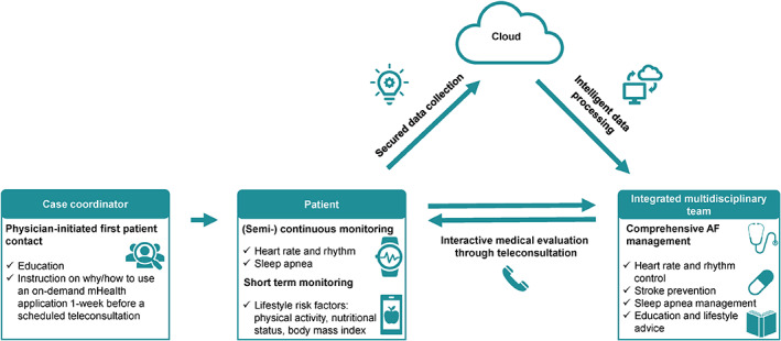 Conclusion: Large scale international mHealth projects, such as TeleCheck-AF, will provide insight into the additional value and potential limitations of mHealth strategies to remotely manage AF patients. Such mHealth infrastructures may be well suited within an integrated AF-clinic, which may require redesign of practice and reform of health care systems.