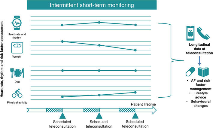 Background: Although novel teleconsultation solutions can deliver remote situations that are relatively similar to face-to-face interaction, remote assessment of heart rate and rhythm as well as risk factors remains challenging in patients with atrial fibrillation (AF).
