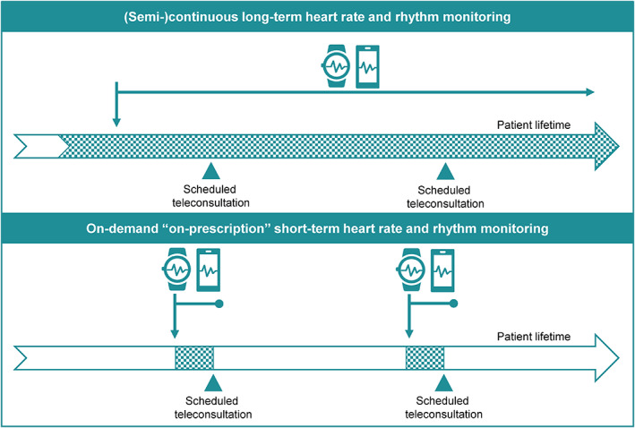 Results: Particularly, in the light of the coronavirus disease 2019 (COVID-19) pandemic, there is decreased capacity to see patients in the outpatient clinic and mHealth has become an important component of many AF outpatient clinics. Several validated mHealth solutions are available for remote heart rate and rhythm monitoring as well as for risk factor assessment. mHealth technologies can be used for (semi-)continuous longitudinal monitoring or for short-term on-demand monitoring, dependent on the respective requirements and clinical scenarios. As a possible solution to improve remote AF care through teleconsultation, we introduce the on-demand TeleCheck-AF mHealth approach that allows remote app-based assessment of heart rate and rhythm around teleconsultations, which has been developed and implemented during the COVID-19 pandemic in Europe.