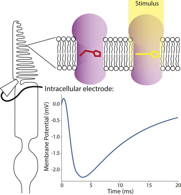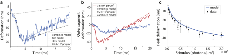 Biological cells deform on a nanometer scale when their transmembrane voltage changes, an effect that has been visualized during the action potential using quantitative phase imaging. Similar changes in the optical path length have been observed in photoreceptor outer segments after a flash stimulus via phase-resolved optical coherence tomography. These optoretinograms reveal a fast, millisecond-scale contraction of the outer segments by tens of nanometers, followed by a slow (hundreds of milliseconds) elongation reaching hundreds of nanometers. Ultrafast measurements of the contractile response using line-field phase-resolved optical coherence tomography show a logarithmic increase in amplitude and a decreasing time to peak with increasing stimulus intensity. We present a model that relates the early receptor potential to these deformations based on the voltage-dependent membrane tension-the mechanism observed earlier in neurons and other electrogenic cells. The early receptor potential is caused by conformational changes in opsins after photoisomerization, resulting in the fractional shift of the charge across the disk membrane. Lateral repulsion of the ions on both sides of the membrane affects its surface tension and leads to its lateral expansion. Because the volume of the disks does not change on a millisecond timescale, their lateral expansion leads to an axial contraction of the outer segment. With increasing stimulus intensity and the resulting tension, the area expansion coefficient of the disk membrane also increases as thermally induced fluctuations are pulled flat, resisting further expansion. This leads to the logarithmic saturation observed in measurements as well as the peak shift in time. This imaging technique therefore relates the structural changes in the photoreceptor to the underlying neurological function of transducing light into electrical signals. Such label-free optical monitoring of neural activity using fast interferometry may be applicable not only to optoretinography but also to neuroscience in general.