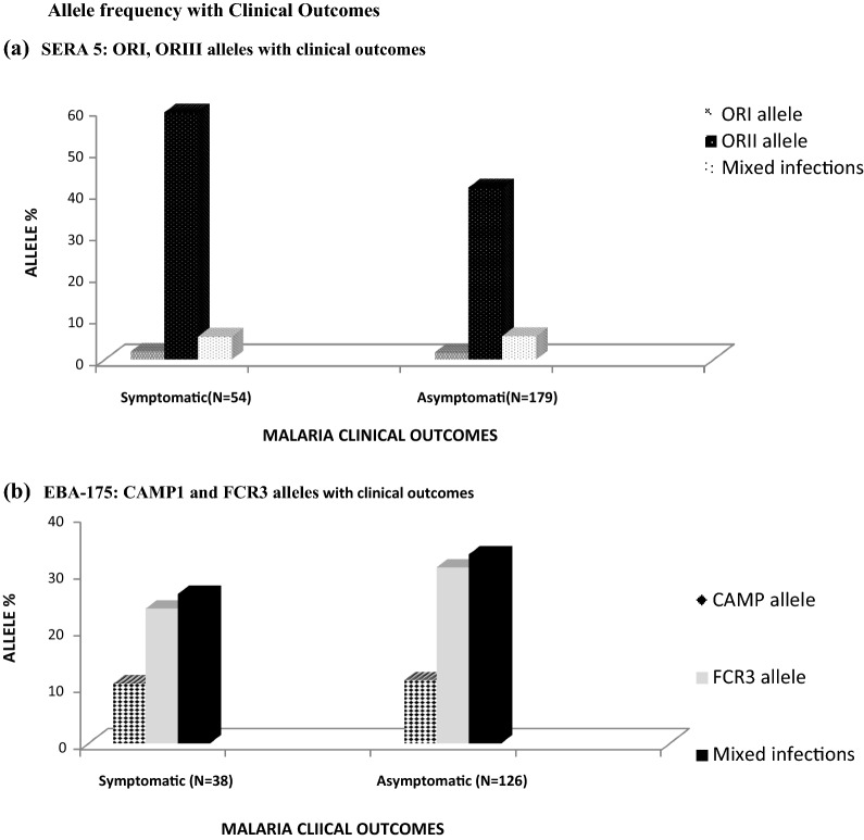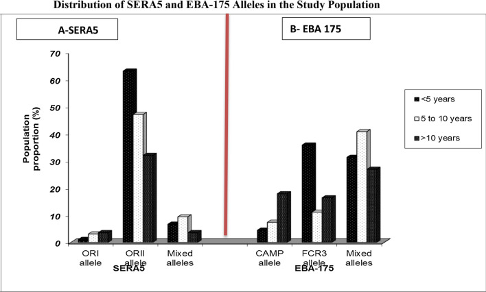Results: Eba-175 FCR3 (48/178) and CAMP (16/178) alleles were observed, the FCR3 (24/67) allele being predominant among children aged below 5 years old while the CAMP (12/67) allele was predominant among older participants. Sera5 alleles ORI (6/204) and ORII (103/204) were observed in the population, ORII was more prevalent and was significantly associated with age (P values < 0.0001), parasite density (P-value < 0.0001) and clinical outcomes (P value = 0.018). There was marked csp diversity in the Th2/Th3 region. Out of 63 sequences, 16 conformed to the reference strain and one (1/16) was similar to a West African haplotype and the majority (14/16) of the haplotypes were unique to this study region. There was an age-dependent distribution of csp haplotypes with more haplotypes being harbored by children < 5-year of age, (10/16) compared to adults (2/16). Interestingly, the csp haplotype corresponding to 3D7 whose prototypical sequence is identical to the sequence of the leading malaria vaccine candidate RTS, S was not observed.