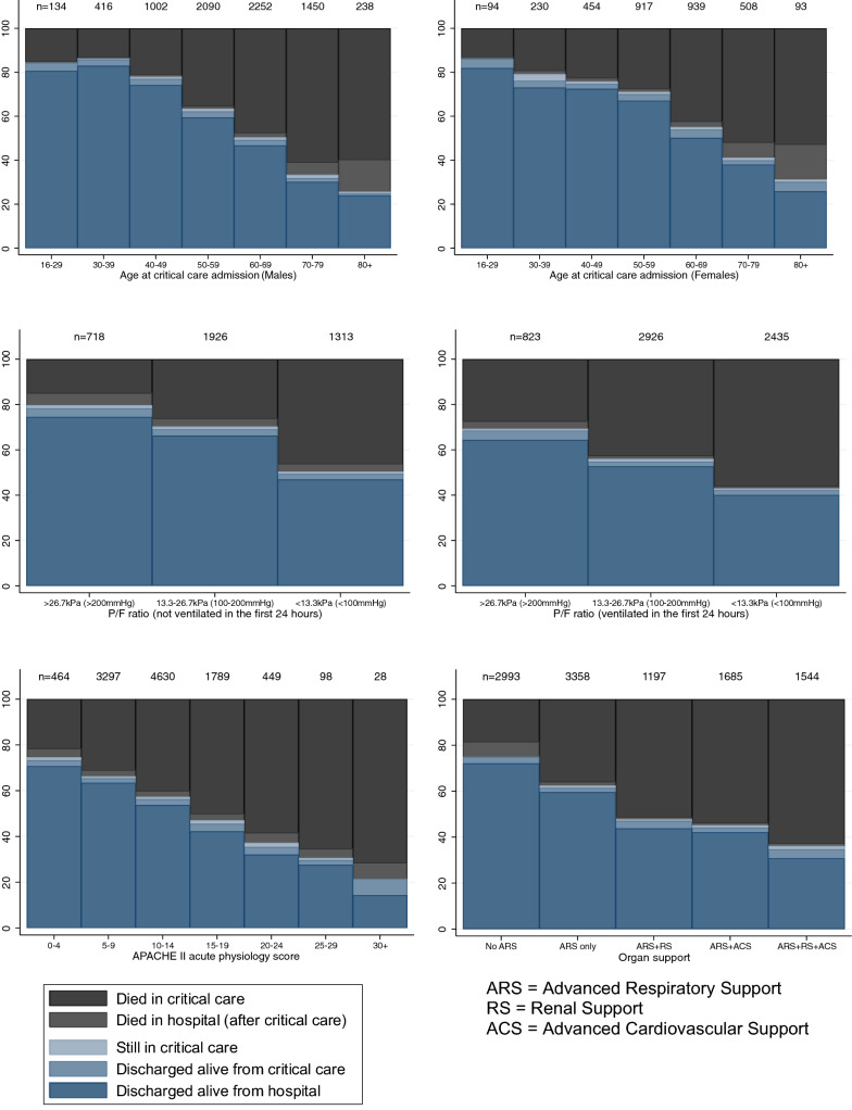 Conclusion: Critical care patients with COVID-19 were disproportionately non-white, from more deprived areas and more likely to be male and obese. Conventional severity scoring appeared not to adequately reflect their acute severity, with the distribution across PaO2/FiO2 ratio categories indicating acutely severe respiratory disease. Critical care patients with COVID-19 experience high mortality and place a great burden on critical care services.