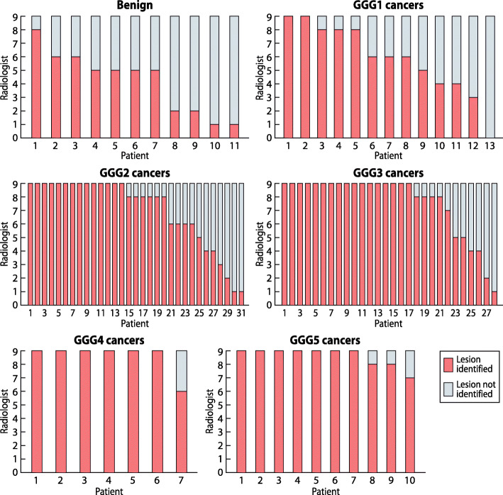 Methods: From January 2014 to January 2018, 100 men aged 50-63 years with clinical suspicion of prostate cancer (PCa) in Helsinki University Hospital underwent MRI. Nine radiologists individually reviewed the pseudonymized MRI scans of all 100 men in two ProScreen trial centers. All 100 men were biopsied according to a histological composite variable comprising radical prostatectomy histology (N = 38) or biopsy result within 1 year from the imaging (N = 62). Fleiss' kappa (κ) was used to estimate the combined agreement between all individual radiologists. Sample data were subsequently extrapolated to 1000-men subgroups of the ProScreen cohort.